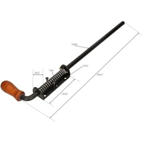 - Caractéristiques techniques – Matériau : métal avec revêtement en poudre – Longueur totale de la barre à ressort : 470 mm – Boulon : 14 mm – Longueur du boulon : 480 mm – Longueur de la plaque : 120 mm – Largeur de la plaque : 40 mm – Trou : 2 x 4 mm et 4 x 6 mm – Poids : 854 g – Poignée en bois laqué