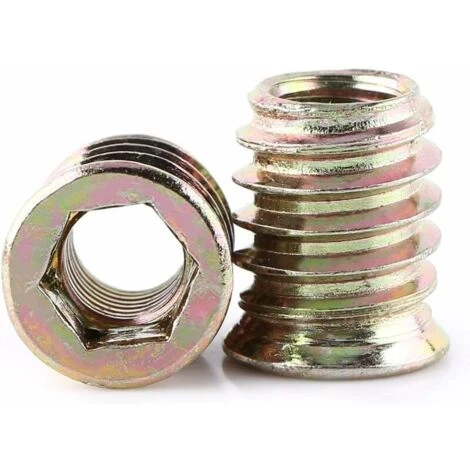 Un écrou d’insertion fournit une douille filetée pour une pièce en bois, semblable à un ancrage mural. Ces écrous d’insertion sont insérés dans un trou pré-percé par vis, dans ce cas, les saillies externes mordent dans le bois, empêchant l’écrou de tourner
