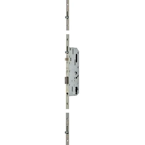 En acier zingué. Coffre de : 210 x 70 x 13 mm (axe à 50 mm) ou 210 x 60 x 13 mm (axe à 40 mm). Têtière de 2150 x 18 x 2,5 mm recoupable. Fouillot de 7 mm, axe à 1045 mm du sol. Entraxe : 70 mm. Condamnation des 3 points de verrouillage par la béquille ou par claquement de la porte. Relèvement possible de la poignée à 90° permettant l’ouverture d’un châssis vitré. Pêne dormant en acier, à 1 tour de clé. Descente forcée des galets par relevage de la béquille. Rouleaux réglables. Main universelle.