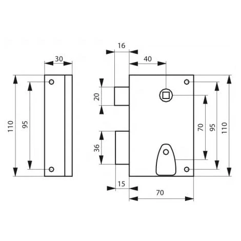 Serrure applique verticale, pene dormant, 1/2 tour, 70×110, gauche, 1 clé.