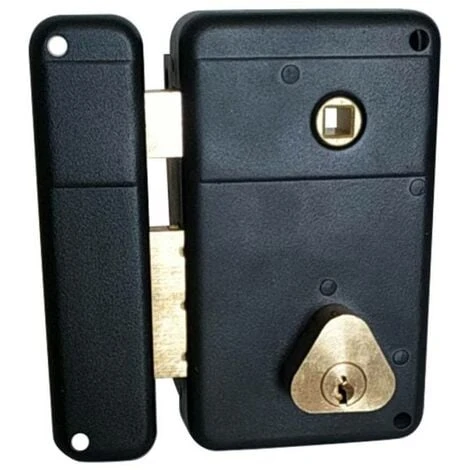 Sureté verticale noire à cylindre renforcé par une masse décorative triangulaire en laiton. Coffre de 130 mm de hauteur x 78 mm de largeur. Mouvement à 2 tours de clé.