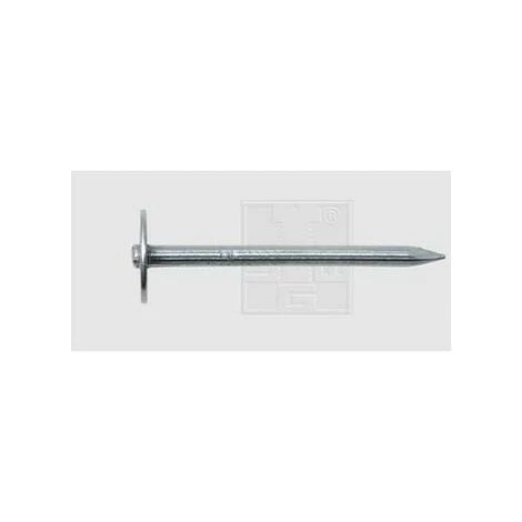 Trempé, adapté pour les fixations de tôle, la tresse de fils et les isolants sur des surfaces telles que le béton, les briques, le plâtre et d’autres matériaux de construction. La forme spéciale de la tête empêche le passage de la tête de clou par le matériau à connecter. Le „forme de disque “ la tête permet un grand diamètre de support., acier galvanisé, carton