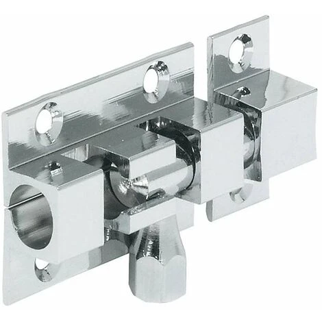 Verrou à broche pour meuble ; Longueur = 40mm ; Hauteur = 25mm ; Matière = Laiton ; Finition = Chromé ; Avec pêne rond coulissant jusqu’à la contre pièce ; Course = 15mm ; A visser (Vis incluses) ; Entraxes = 25mm