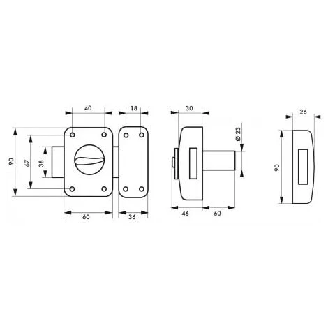 Coffre et gâche acier embouti. Pêne acier nickelé. Bouton ABS chromé. Cylindre laiton à 5 goupilles. Entrée laiton. 3 clés en acier nickelé.